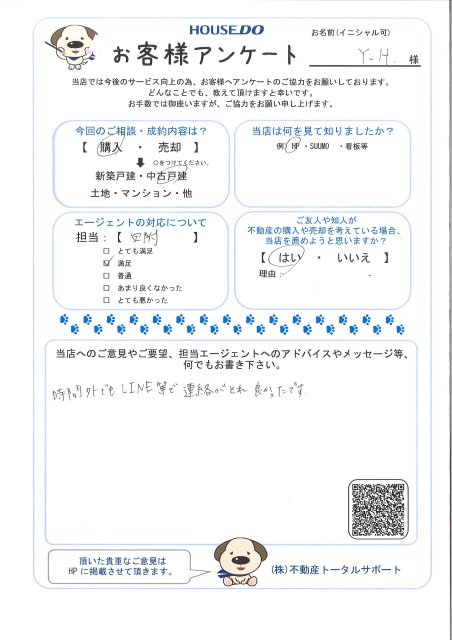 今回のご相談・成約内容は? 購入→中古戸建 当店は何を見て知りましたか? HP エージェントの対応について 担当:田附 ○満足 ご友人や知人が不動産の購入や売却を考えている場合、当店を薦めようと思いますか? はい 当店へのご意見やご要望、担当エージェントへのアドバイスやメッセージ等、何でもお書き下さい。 時間外でもLINE等で連絡がとれ良かったです。