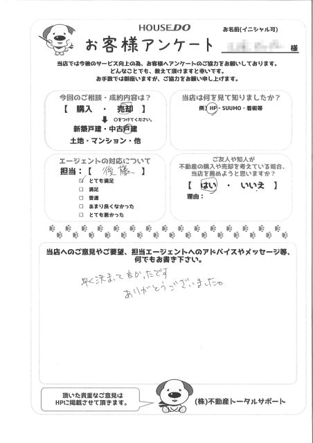 当店へのご意見やご要望、担当エージェントへのアドバイスやメッセージ等、何でもお書き下さい。