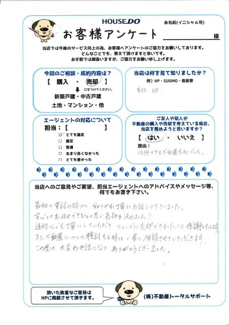 最初の電話の時から分かりやすく丁寧にお話して下さいました。安心してお任せできるなと思い売却を決めました!連絡なども丁寧にしていただき、スムーズに売却できましたこと感謝いたします。また不動産について検討する時は一番に相談させていただきます。この度は大変お世話になりありがとうございました。